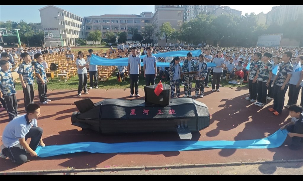 开幕式上,九(3)班以一出围绕中国核潜艇部队创编的话剧惊艳全场。在总导演朱羽岑同学的精心策划与编剧朱满怡同学的巧妙构思下,黄子壹、方胤皓、朱明旭、庄智辉等主演同学通过铿锵有力的台词与富有张力的表演,生动展现了我国海军将士的英勇与坚韧。特别感谢承包本次所有道具的方胤皓同学和黄子壹同学。整场话剧节奏紧凑、情感饱满,赢得了评委与观众的一致好评,最终荣获“最佳创意奖”。与此同时,班级方阵步伐整齐、精神抖擞,以出色的表现摘得“最佳队列奖”,为九(3)班的运动会征程奠定了高光起点。