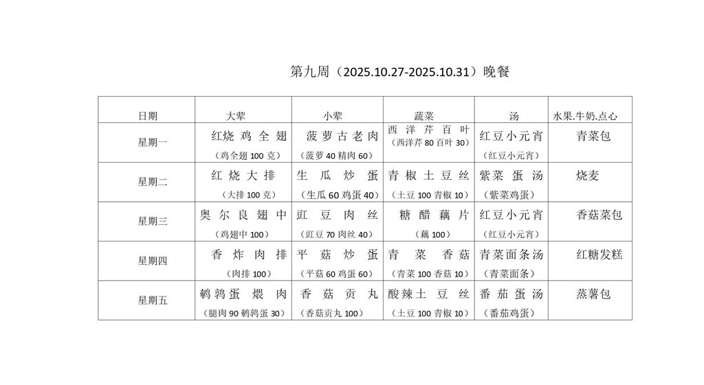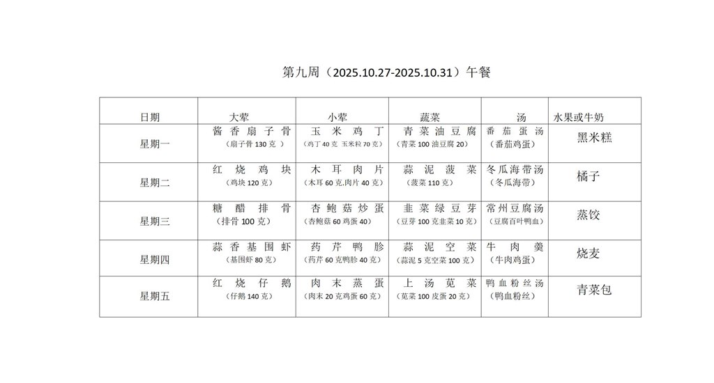 正衡中学天宁分校2025-26学年第一学期第九周菜单