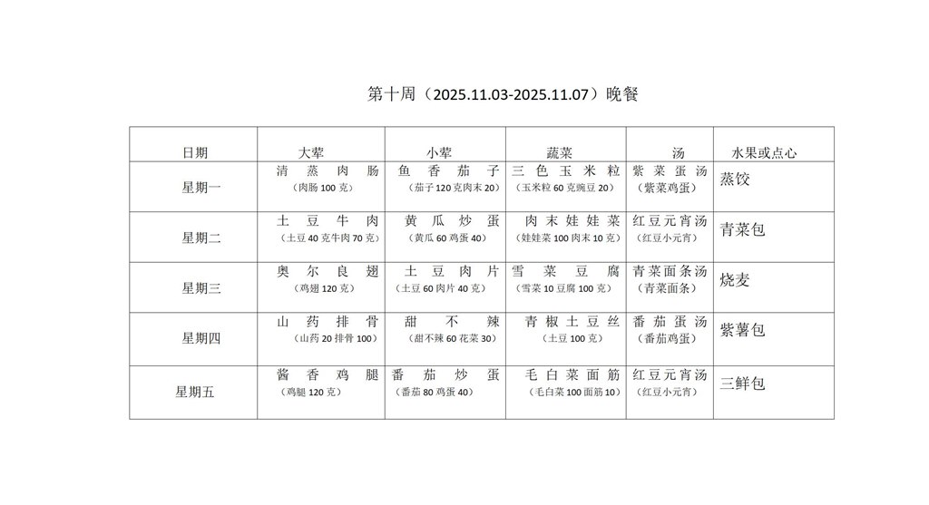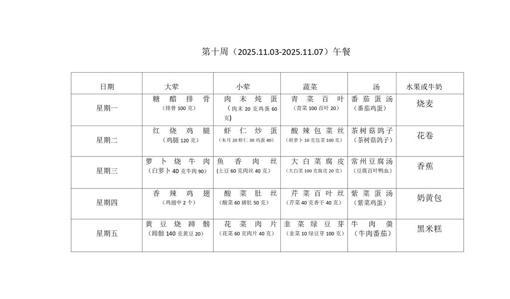 正衡中学天宁分校2025-26学年第一学期第十周菜单