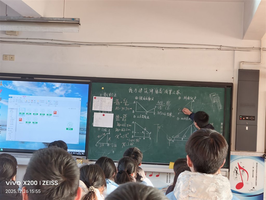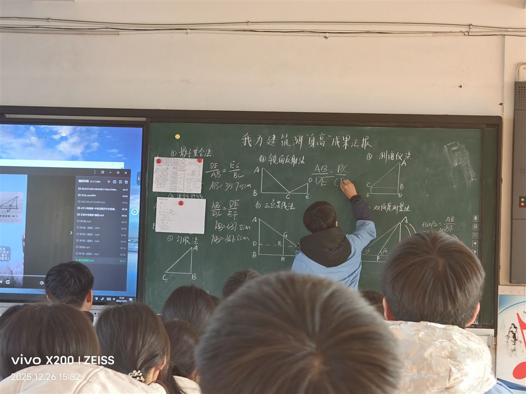 活动前期,各班学生自由组队,化身“小小测量师”。从制定测量方案、选取测量工具,到实地勘测数据、分析计算结果,每个小组都有条不紊地推进研究。过程中,同学们不仅运用了相似三角形、勾股定理等数学知识,还巧妙结合物理测量原理,解决了实际操作中的诸多难题。为了更好地呈现研究成果,各小组精心制作演示视频与主题海报,将测量过程、原理分析、成果总结等内容生动呈现,一张张色彩鲜明的海报、一段段逻辑清晰的视频,凝聚着每个团队的智慧与汗水。